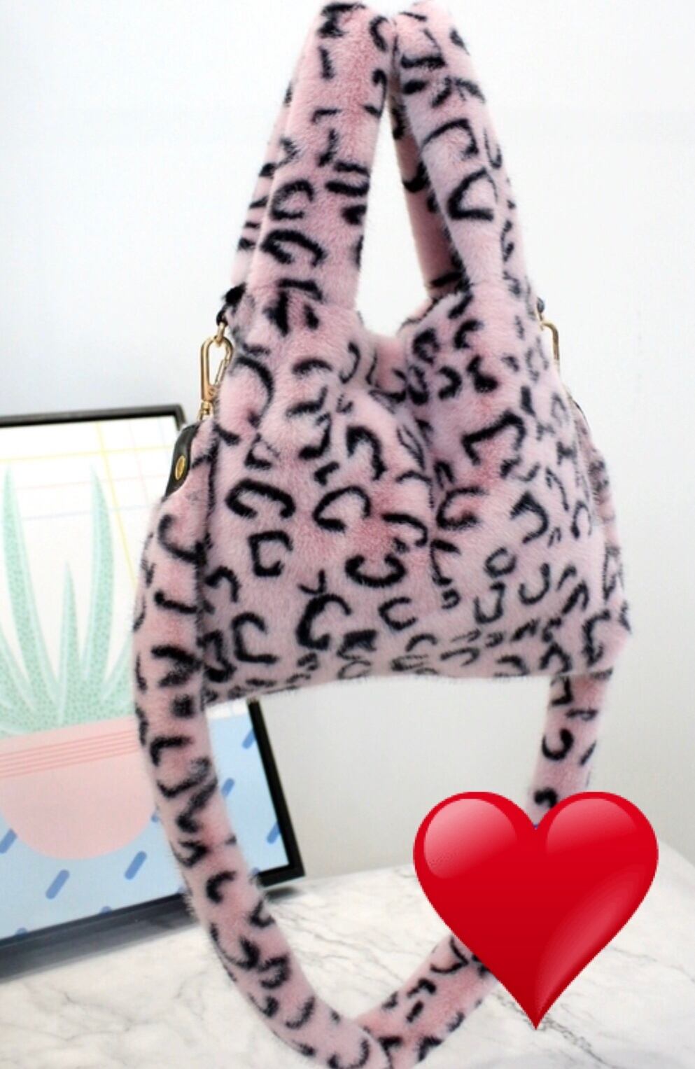 ピンクヒョウ柄もふもふショルダーつきバッグ
